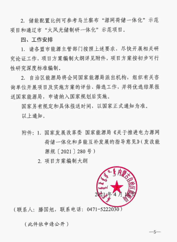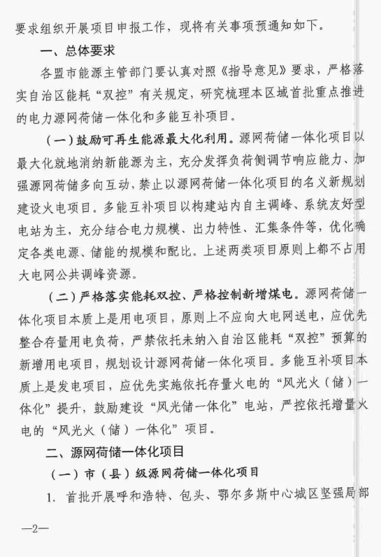 另外,近日内蒙古自治区能源局发布组织申报首批重点推进电力源网荷储一体化和多能互补项目的预通知。