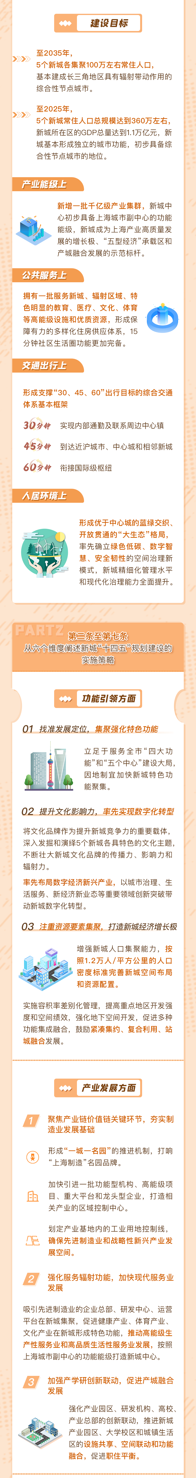 到2035年,5个新城各集聚100万左右常住人口,基本建成长三角地区具有辐射带动作用的综合性节点城市。到2025年,5个新城常住人口总规模达到360万左右,新城所在区的GDP总量达到1.1万亿元,基本形成独立的城市功能,在长三角城市网络中初步具备综合性节点城市的地位。具体表现为: