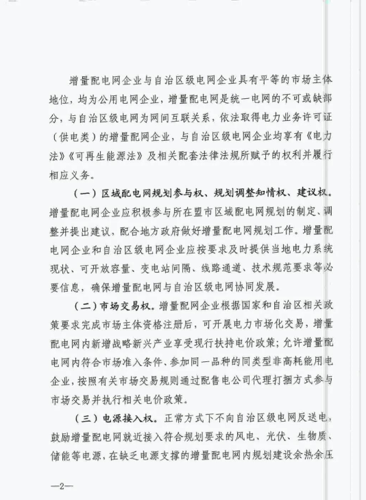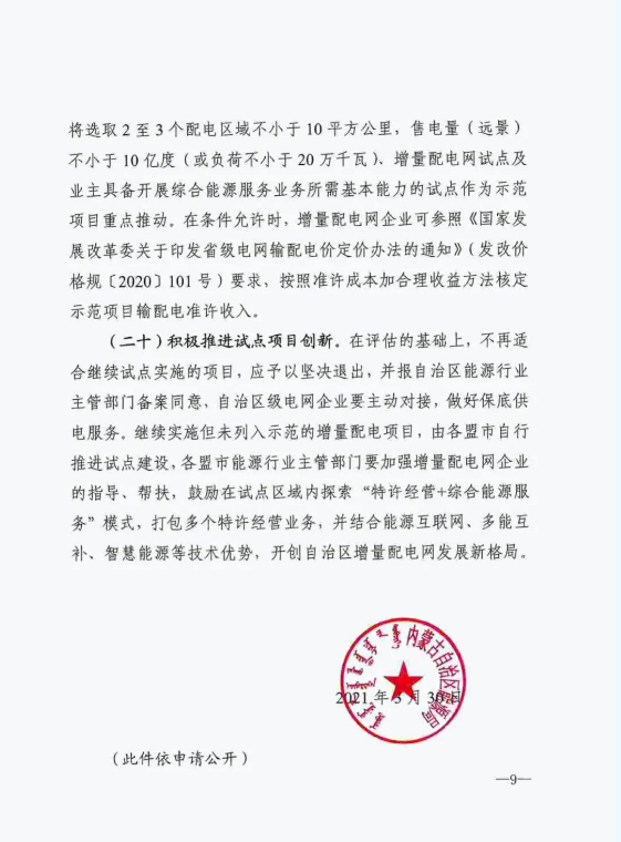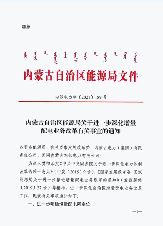 近日,内蒙古自治区能源局发布《关于进一步深化增量配电业务改革有关事宜的通知》。