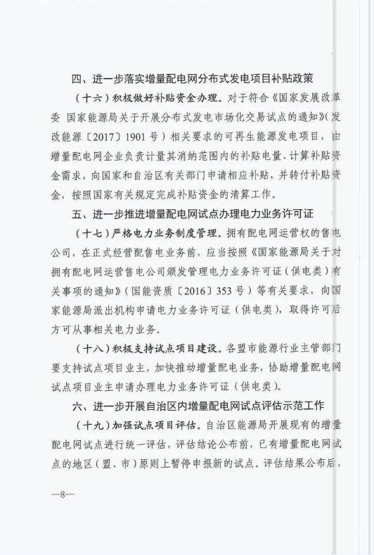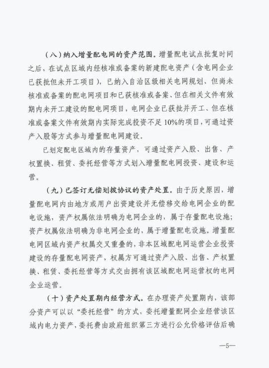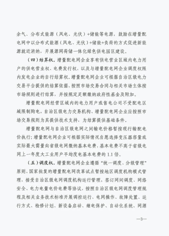 《通知》主要包括六部分内容。第一部分为明确增量配电网定位,明确了增量配网企业享有区域配电网规划参与权、规划调整知情权、建议权;市场交易权;电源接入权;结算权;调度权;计量管理权;独立决策权等权利。第二部分为加快推进存量资产处置,确定了纳入增量配电网的资产范围及资产处置方式等内容。第三部分为加强增量配电网管理,明确了规章规范要求、规划修编管理、依规建设依法处置等。第四部分为落实增量配电网分布式发电项目补贴政策;第五部分为推进增量配电网试点办理电力业务许可证,严格电力业务 制度管理、积极支持试点项目建设;第六部分为开展自治区内增量配电网试点评估示范工作。《通知》指出,进一步明确增量配电网定位。增量配电网企业与自治区级电网企业具有平等的市场主体地位,均为公用电网企业,增量配电网是统一电网的不可或缺部分,与自治区级电网为网间互联关系,依法取得电力业务许可证(供电类)的增量配网企业,与自治区级电网企业均享有《电力法》《可再生能源法》及相关配套法律法规所赋予的权利并履行相应义务。