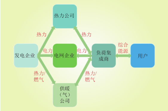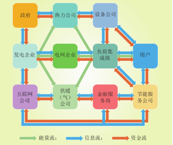 在园区综合能源服务中,存在政府(园区管委会)、电网企业、发电企业(分布式发电)、供暖(气)公司、热力公司、用户、售电公司(负荷集成商)、设备公司、节能服务公司、互联网企业和金融服务商等相关利益方。