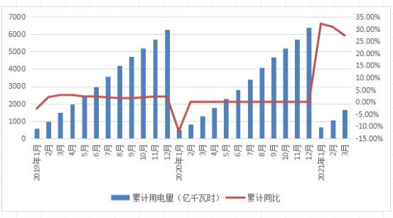 (一)用电增速大幅回升,总体延续去年下半年以来的稳定恢复态势。一季度,江苏全社会用电量1647.25亿千瓦时,同比增长27.39%,比2019年增长10.6%。新冠疫情导致停工停产使得去年同期用电基数偏低,加之一月份受低温天气影响,是用电量增速较高的主要原因。但与2019年相比,两年用电量年均增幅为5.1%,略高于“十三五”整体水平(“十三五”期间,全省全社会用电量年均增长4.5%)。