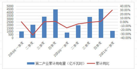 分产业看,一季度,第一产业用电量10.86亿千瓦时,同比增长32.39%(比2019年增长33.45%);第二产业用电量1111.45亿千瓦时,同比增长29.76%(比2019年增长10.42%);第三产业用电量267.89亿千瓦时,同比增长36.17%(比2019年增长13.24%);城乡居民生活用电量257.04亿千瓦时,同比增长10.99%(比2019年增长7.74%)。
