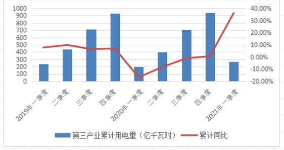 分行业看,一季度,工业恢复程度超过往年水平,规上工业增加值同比增长33.6%,两年平均增长11%。全省工业用电量1095.97亿千瓦时,同比增长29.5%(比2019年增长10.46%)。高技术制造业用电加速增长,一季度累计用电增速达37.4%,快于工业用电增速7.9个百分点,显示高技术制造业在构建新发展格局中扮演的重要角色。机械、纺织、建材、轻工等行业用电量高速增长,累计增长34.6%-42.9%。这些作为传统劳动密集型或出口重点行业,去年因疫情受企业复工推迟、开工不足、需求下降影响,基数偏低。由于国内疫情防控形势较好,今年春节期间“留工稳产”等政策措施,行业市场需求趋盛,用电量迅速回升。为抗击疫情,受用药需增加等因素影响,医药行业用电量迅速恢复。传统优势产业用电量稳步回升。电子行业受疫情影响较小,用电量保持一定增幅,同比增长超过25%。近年来我省加大化工行业专项整治力度,推进化工行业结构调整,化工企业数量明显减少,导致用电量不及2019年同期。第三产业用电增速呈现快速增长态势,一季度,第三产业中,租赁和商务服务业、住宿和餐饮业及批发和零售业同比增长超过45%。分别为51.19%、49.2%、48.59%。