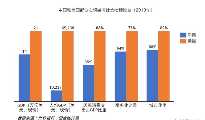 美国是全球最发达经济体,GDP总量和人均GDP均居世界前列。中国GDP总量居全球第二,但2019年中国人均GDP仅占美国的16%,2020年末才消除贫困。中国计划在2035年左右基本实现代化,人均国民生产总值达到中等发达国家水平。中美在居民消费支出占GDP比重、服务业占比、城市化率等经济社会指标方面有较大差异。