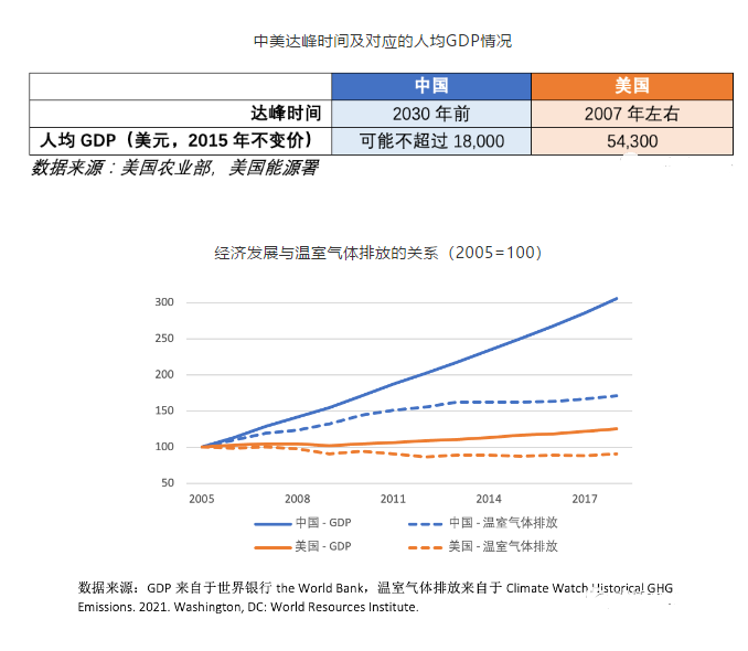 中国碳排放仍未达峰,美国在2007年达峰。中国经济快速增长,温室气体排放也在上升,但增长速度明显小于经济增速。美国经济低速增长,温室气体在2007年达峰后进入平台期。中国达峰时人均GDP可能仅为美国达峰时的三分之一,中国将在达峰后的30年内实现碳中和,美国从达峰到碳中和经历40年的过渡期。