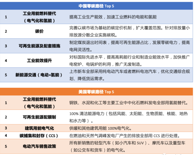 尽管中美两国政策侧重不同,我们仍可看到两国均需要在工业、建筑及交通行业实现电气化和氢能利用,并对非二氧化碳温室气体实施相应的减排措施。同时,可再生能源也将为两国达到零碳目标做出重要贡献。
