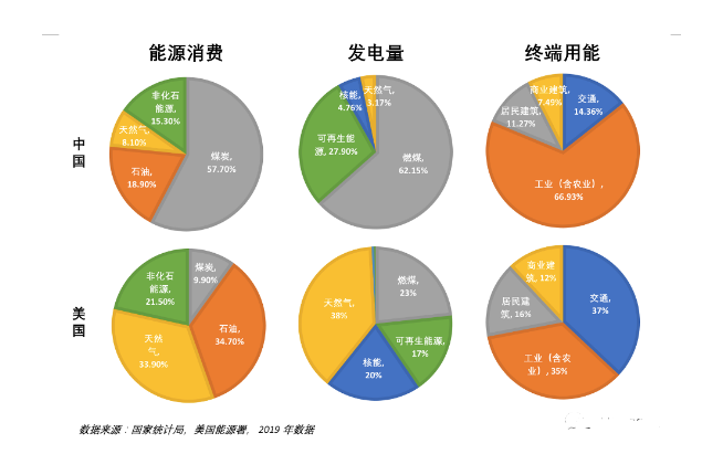 中国能源消费结构以煤炭为主导,而美国是以石油和天然气为主,分别占34.7%和33.9%,石油和天然气碳排放因子低于煤炭。中国火电结构以煤电为主,美国火电主要是天然气发电。能源终端消费结构,中国工业部门消费占绝对主导,美国则主要是交通部门排放。中国碳中和路径面临能源结构的低碳化和工业升级优化的双重挑战。