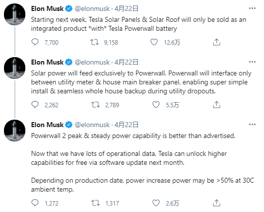 上周,该公司修改了其网站内容,防止客户只购买太阳能或其Powerwall储能产品,而是要求购买一个系统。马斯克后来在一条推文中宣布了这一举措,称 "太阳能产品将完全供给Powerwall","Powerwall将只在公用事业电表和房屋主断路器面板之间进行接口,实现超级简单的安装,并在公用事业停电期间实现无缝的全屋备份"。