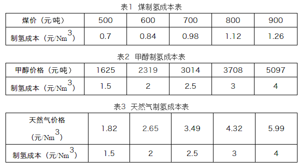 甲醇制氢投资较低,适合2500Nm3以下制氢规模,按照1Nm3氢气消耗0.72千克甲醇,甲醇价格按2319元/吨计算,制氢成本如表2;
