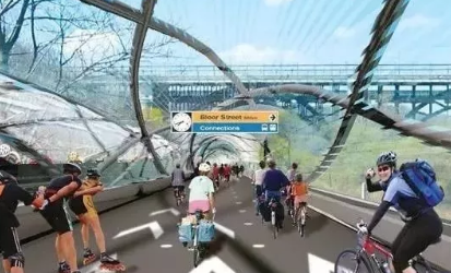 一种封闭式自行车高速路的想象图:道内可防止下雨等自然变化,未来还可能有气流动力助推,可替代汽车高速路连接城市。