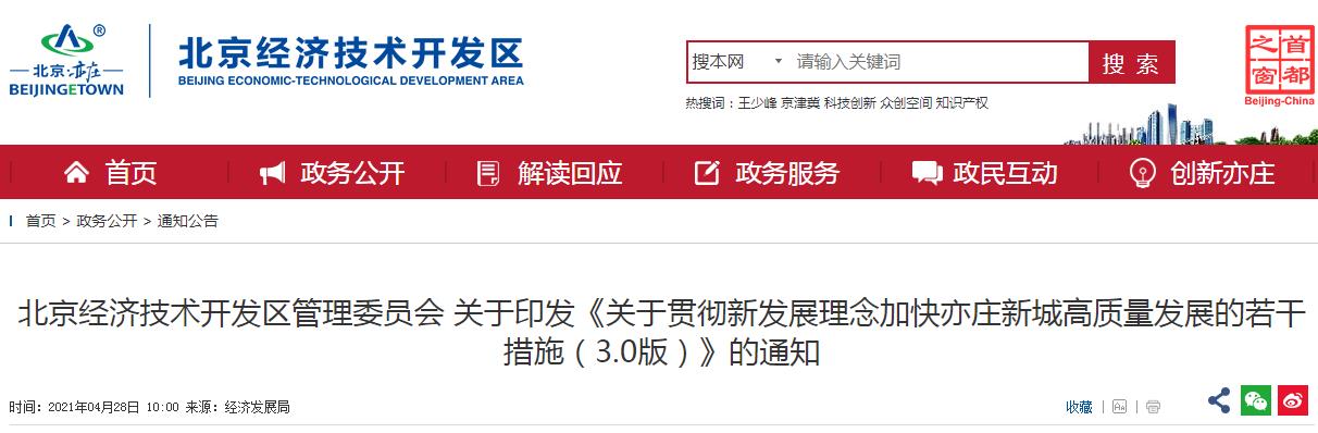 《关于贯彻新发展理念加快亦庄新城高质量发展的若干措施(3.0版)》已工委管委会研究通过,现印发给你们,请认真遵照执行。