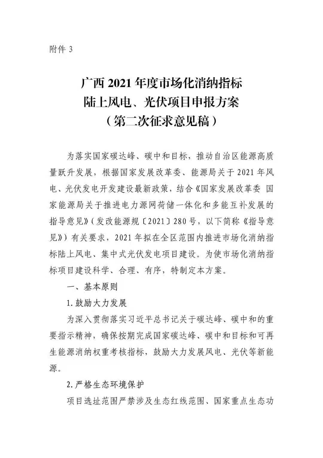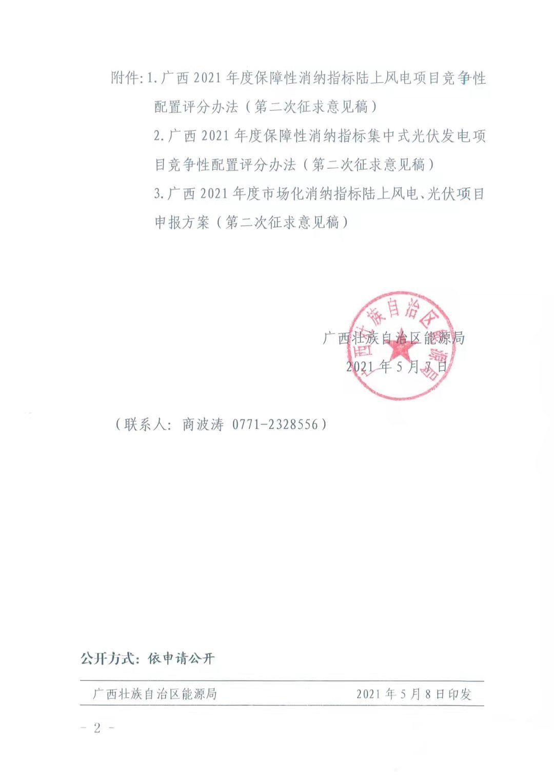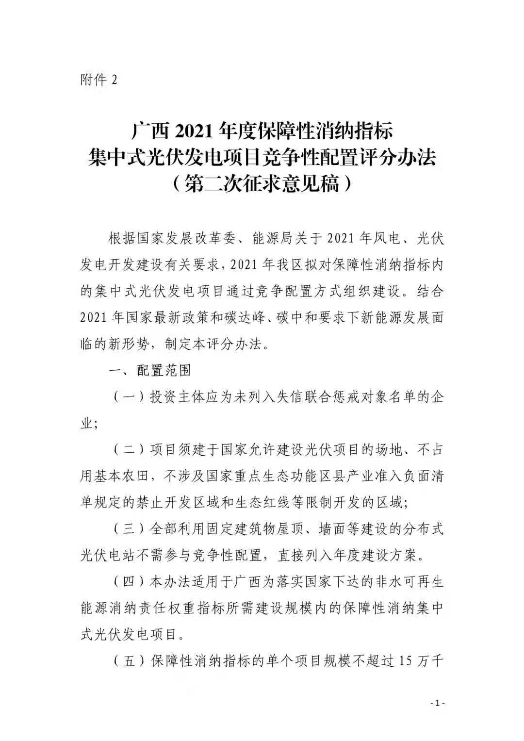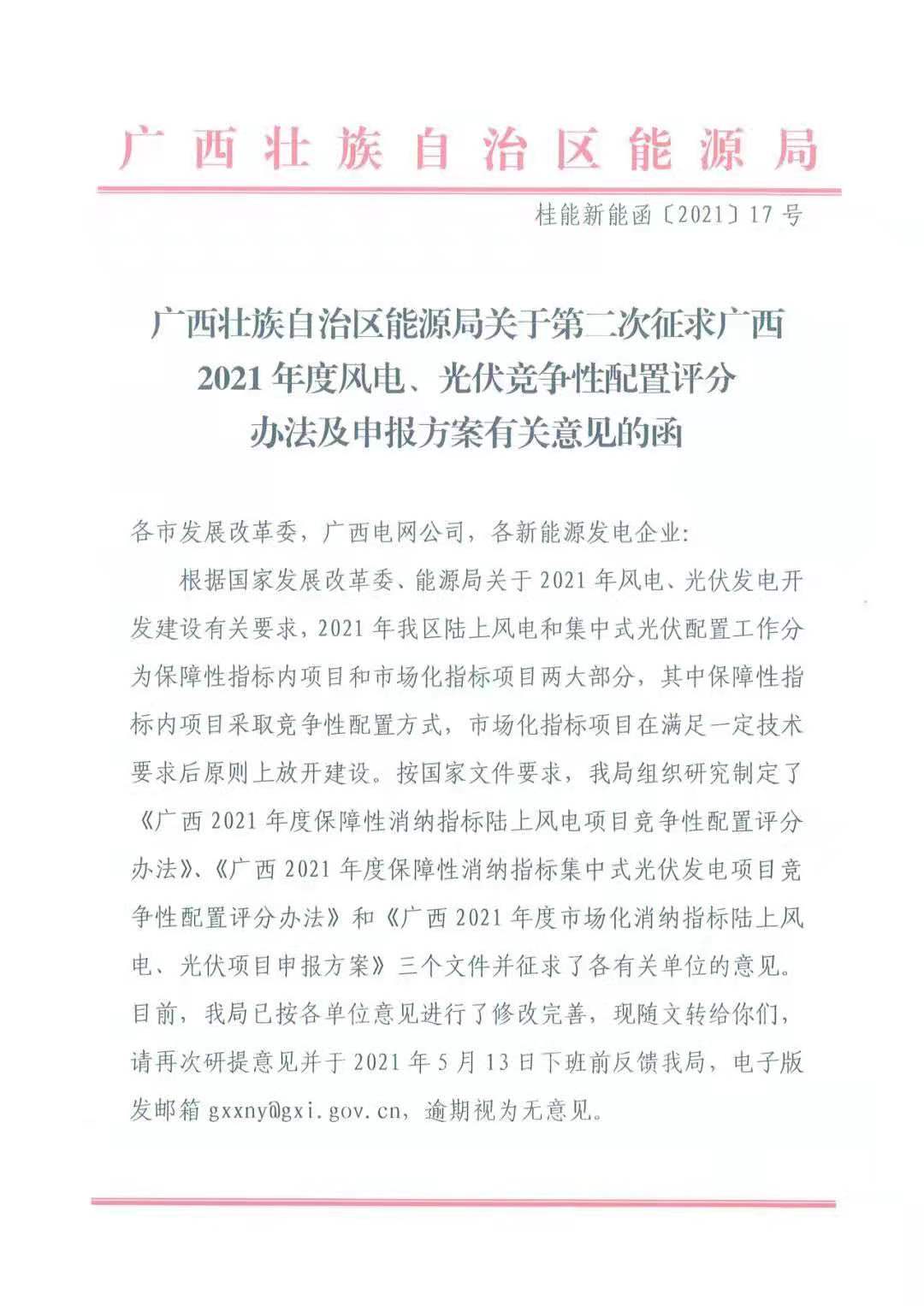 广西能源局再次就2021年度风电、光伏竞争性配置评分办法征求意见。