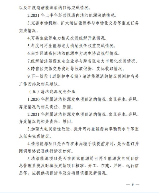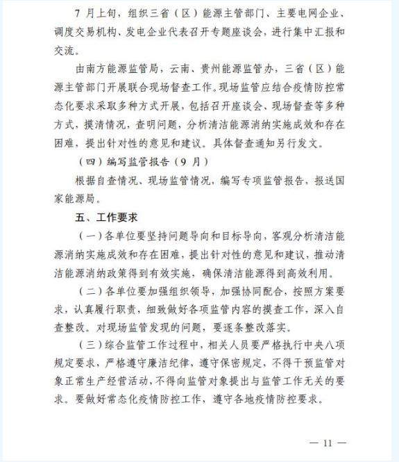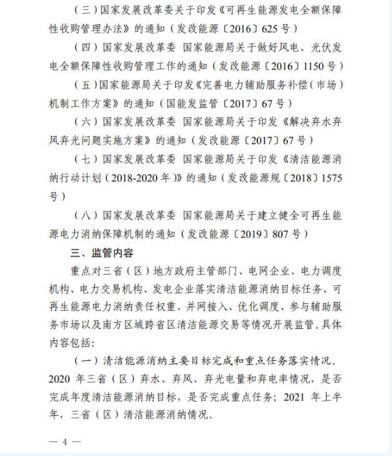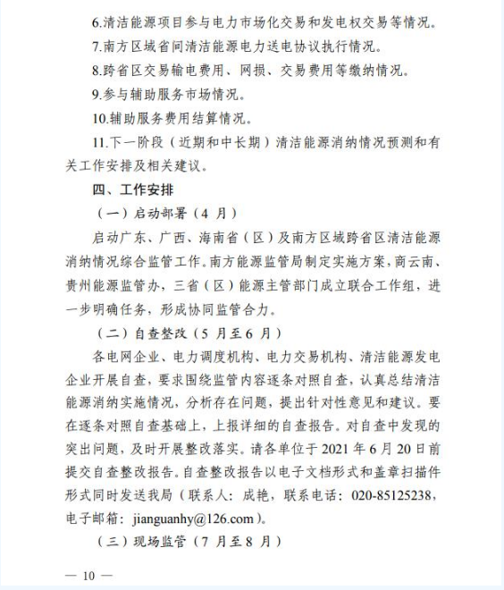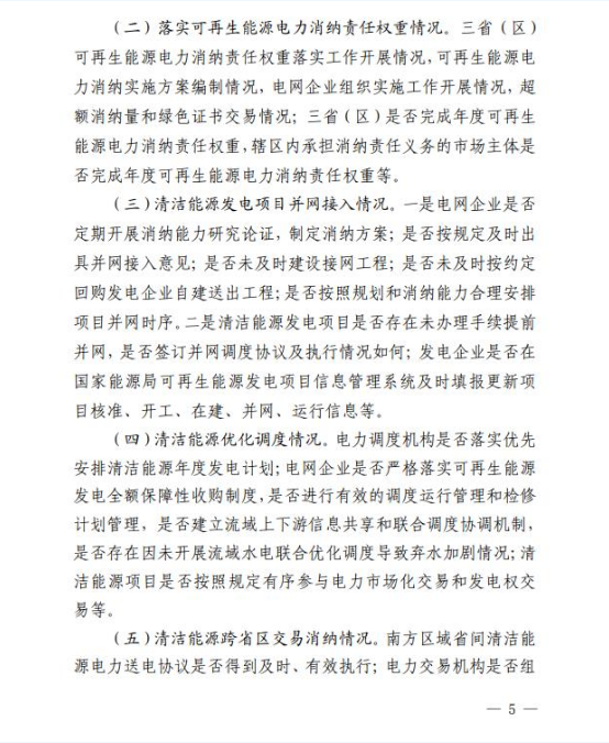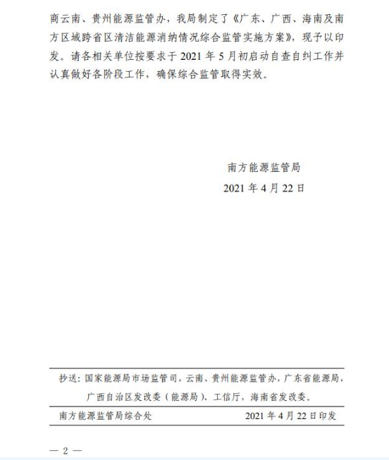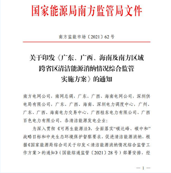 南方能监局印发《广东、广西、海南及南方区域跨区跨省清洁能源消纳情况综合监管实施方案》,重点对三省(区)地方政府主管部门、电网企业、电力调度 机构、电力交易机构、发电企业落实清洁能源消纳目标任务、可再生能源电力消纳责任权重、并网接入、优化调度、参与辅助服 务市场以及南方区域跨省区清洁能源交易等情况开展监管。