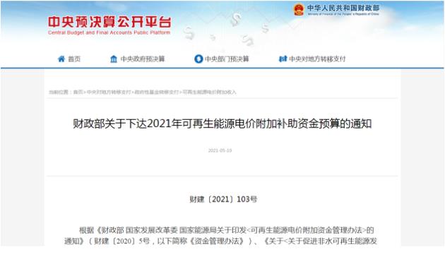 5月10日,财政部官网发布关于下达2021年可再生能源电价附加补助资金预算的通知。