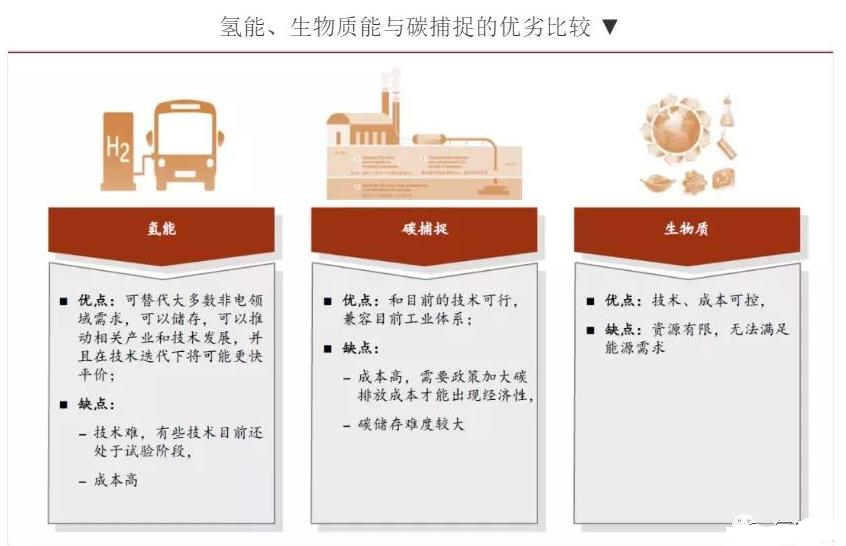 实现碳中和必须在非电领域推动新的技术发展和应用,目前来看主要有三个解决方案,分别是氢能源、碳捕捉和生物质。但是考虑到生物质资源上的限制,以及碳捕捉对于政策要求,氢能在产业发展,技术迭代上优势更强,因此更有可能是最终解决方案。