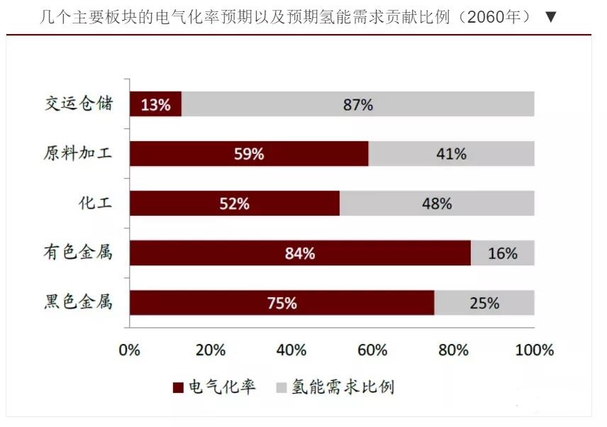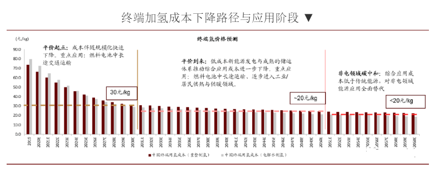 此阶段受益于新能源发电成本进一步下降,储运规模的大幅提升下应用环节成本的进一步下降,氢加注成本将下降至20元/kg以下,非交通领域氢应用成本将下降至15元/kg以下。应用领域将全面拓展至供热供暖、船舶等非电领域,补足非电领域碳中和的拼图。