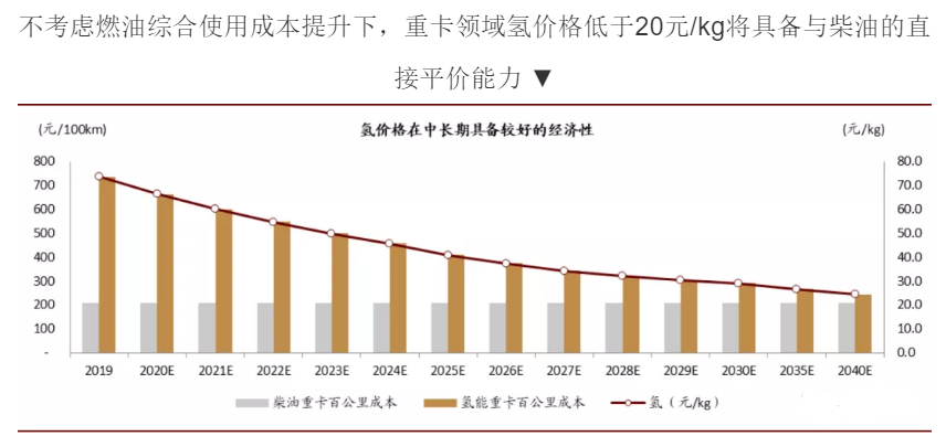 对于燃料电池车辆,当不考虑柴油针对碳排成本上升时,氢成本下降至20元/kg可直接与柴油平价。此外,此阶段的非交通领域用氢的价格已逐步下降至18-20元/kg(即不考虑加氢站的加注成本),在工业与家庭供暖领域已逐步具备一定经济性基础,通过初期与天然气的混合使用,以及伴随氢价格的进一步下降,在供暖领域,氢能也将逐步提升应用渗透率。