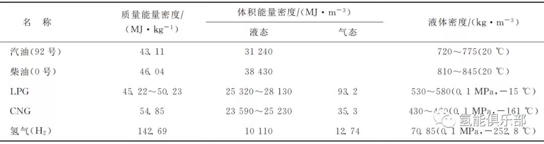 可以看出:氢气作为交通动力燃料,其质量能量密度的优势明显,为142.69MJ/kg,是汽柴油能量密度的3倍以上,是车用液化气(LPG)和压缩天然气(CNG)的2倍以上;但从体积能量密度看,氢气没有优势,气态时其体积能量密度不到LPG的1/8和天然气的1/3,液态时其体积能量密度不到汽柴油的1/3,LPG和天然气的1/2。这是由氢气的本性决定的。