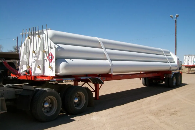 长管拖车由牵引车和管束车组成,牵引车和管束车可分离,所以管束车也可用于加氢站辅助储氢。长管拖车整车(含牵引车)自重约36 t,满载装填的氢气重量约0.32 t,到达加氢站后,管束内氢气卸载率一般70%~85%的氢气。长管拖车运输方便,技术成熟,管理经验丰富,是当前国内外多数加氢站运输氢气的首选。但长管拖车运输的氢气重量约占拖车总重的1%,而且装卸时间一般需要4h左右,所以运输效率很低。未来燃料电池车规模发展壮大后,依靠长管拖车运输氢气肯定难以保障供应。