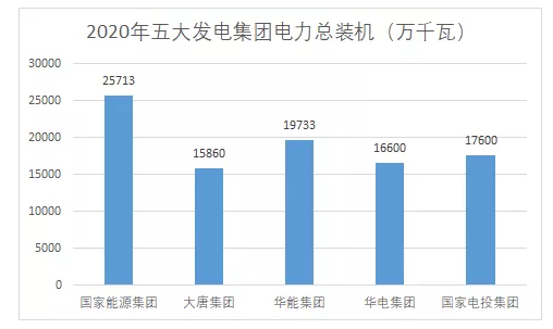 截至2020年底,国家能源集团、大唐集团、华能集团、华电集团、国家电投集团电力总装机分别为25713万千瓦、15860万千瓦、19733万千瓦、16600万千瓦、17600万千瓦。