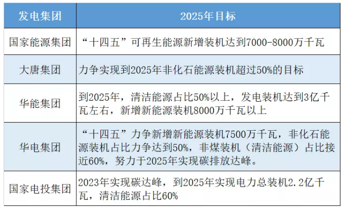 从“十四五”发展趋势看,截至目前,五大发电集团全部公布了2025年的发展目标,除国家能源集团外,其他四大发电集团都公布了2025年清洁能源装机占比目标。