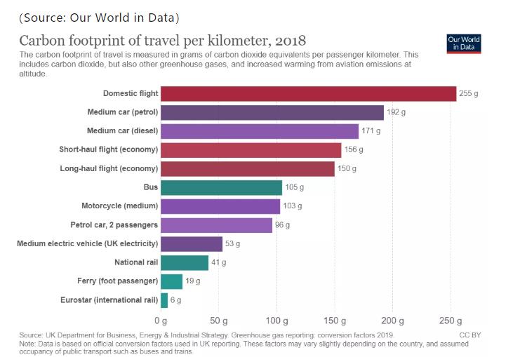 在某些国家/地区(通常是较富裕的国家,居民经常出行),运输可能是产生个人的碳足迹最主要的部分。在上面的图表中,我们可以看到出行方式通过碳足迹进行的比较。这些是通过每人行驶一公里所排放的温室气体量来衡量的。这些数据来自英国政府用于温室气体报告的方法论论文,被各大公司广泛用于量化和报告其排放量。温室气体以二氧化碳当量(CO2eq)进行衡量,这意味着它们还解释了非CO2温室气体和高海拔地区航空排放的温室效应。总体而言,最低碳的出行方式是步行,骑自行车或火车。在短途旅行中使用自行车代替小汽车可以减少约75%的旅行排放量。在中等距离内乘坐火车而不是汽车,可以减少约80%的排放。 使用火车代替国内航班可以减少约84%的排放。但是,排放的差异可能很大,这主要取决于以下因素:a)您的旅行时间长短,b)您当地电网的电力来源,c)公共交通的占用情况以及d)车辆和乘客人数。在中短距离内,步行或骑自行车几乎始终是最低碳的出行方式。虽然未在图表中显示,但根据您骑车的效率和饮食的不同,骑行一公里的碳足迹通常在每公里16至50克CO2eq的范围内。