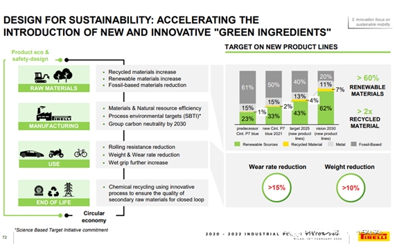 倍耐力提出加速推进“绿色配方”,和可回收、可再生材料的使用,于2030年达到碳中和。该发展目标贯穿上游原材料、生产制造、下游终端产品的各个生产、应用环节,体现社会可持续、生态可持续的企业发展理念。公司未来产品线所使用的原材料将符合:可再生材料的用量自2017年的23%,至2025年将增加近一倍占比,达到43%,至2030年达到62%;而基于石化材料的使用,将从2017年的61%,减少至2025年的40%,以及2030年的20%。未来10年,倍耐力将大比例以可再生、可回收材料替代石化基材料。