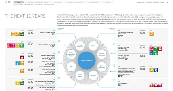 韩泰轮胎于2009年设立CSR(Corporate Social Responsibility)公司社会责任部门,拥有很高的行政和管理权限,确保到2030年,企业所生产的产品实现80%对生态环境无害化(eco-friendly),温室气体较2013年减排15%,水资源消耗较2018年减少30%,排废较2018年减少30%,供应商100%通过CSR评估,相较2018年多创造20%的社会价值,以及女性领导的比例增加至10%;到2050年,韩泰将100%使用绿色可回收原材料,温室气体排放较2018年减少50%,相较2018年多创造50%的社会价值。