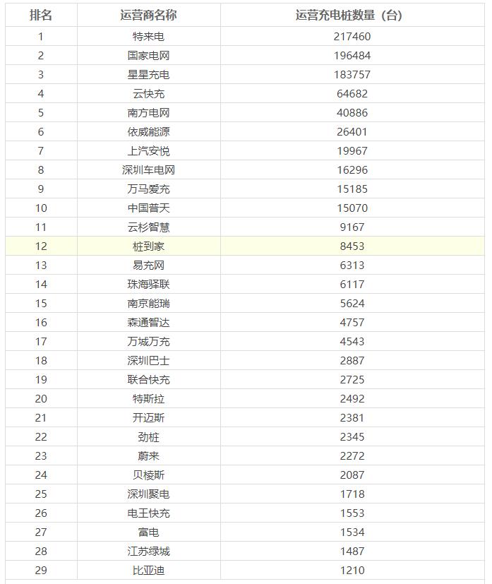 截至2021年4月,国内充电运营企业运营充电桩数量超过10万台的共有3家,运营超过1万台的共就有10家,排在第一的是特来电,运营217460台充电桩、国家电网排名第二,运营196484台充电桩、排名第三的是星星充电,运营183759台充电桩。具体数据请参考下表。