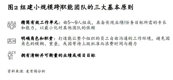 俗话说兵贵神速。面对市场大量的突发状况,企业如果延续以往的风格,自上而下发布指令,由各个层级陆续响应,容易导致耗时过长、效率低下的局面。相反,企业应积极动员整个组织,明确任务的优先次序,广泛听取员工意见获取最前线的客户反馈并快速落实相关解决方案。把研发、制造、供应链、销售等职能并联起来,通过小规模跨职能团队的模式,快攻快打,抢占先机。组建小规模跨职能团队有三大基本原则(见图2):