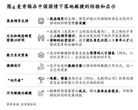 上述五个角度只供中国车企参考,究竟什么样的“敏捷转型”之路适合自己,还是应该交由企业自行判断。值得一提的是,这五大特征虽说各有千秋,但我们的经验和研究结果表明,只有五项特征共同发挥作用,企业才能实现真正的敏捷。一方面,管理层需要站得更高、看得更远、做得更快,精准把控时机并及时调整业务方向。他们在灵活建立网格式架构和精简流程的同时,必须全力协调各部资源、盘活组织,缩短产品周期,并充分实现信息在组织内外的快速交互。唯有让产品充分体现出市场和客户需求,企业才能提升交付质量,改进客户关系。另一方面,管理层必须提升企业的凝聚力,在组织上下贯穿统一的使命和愿景。在践行“以人为本”理念的过程中,注重核心人才和核心能力的培养,加强员工归属感,提升组织整体能力。此外,基于我们在中国的敏捷实践经验,我们总结了实现敏捷转型的六大关键成功因素(见图4)。