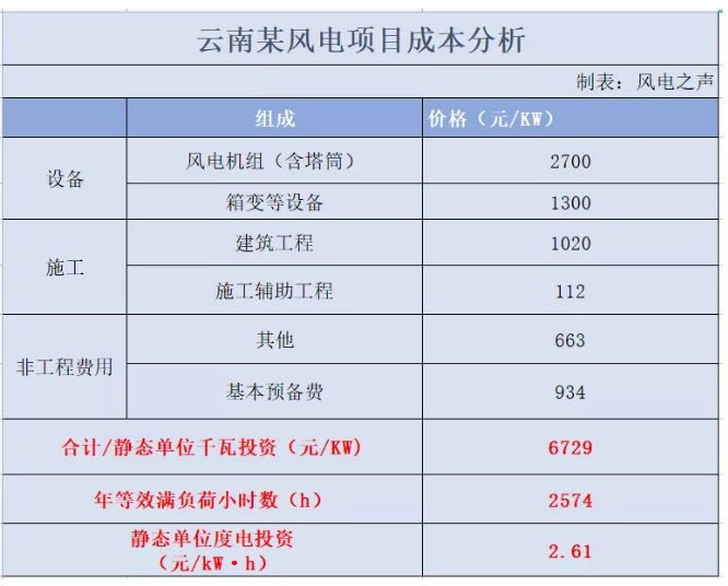 根据「风电之声」获取的某项目财务概算,云南风电项目综合造价低至6729元/KW,按照年等效利用小时数2574h计算,其静态单位度电投资2.61元/KWh。