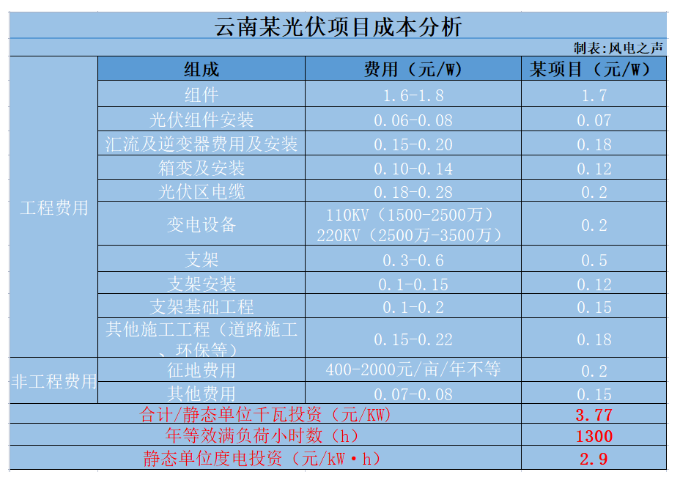 但是,光伏组件涨价之后,按照近期中标均价计算,取1.7元/W,云南地区某光伏项目的综合成本高达3.77元/W,折算度电投资2.9元/KWh,比当地风电度电投资2.61元/KWh,高出接近3毛的成本。