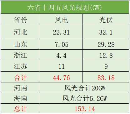 加上海南和河南的“十四五”风光规划,六省累计风光计划新增153.14GW。