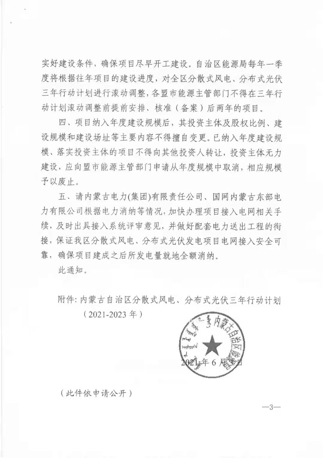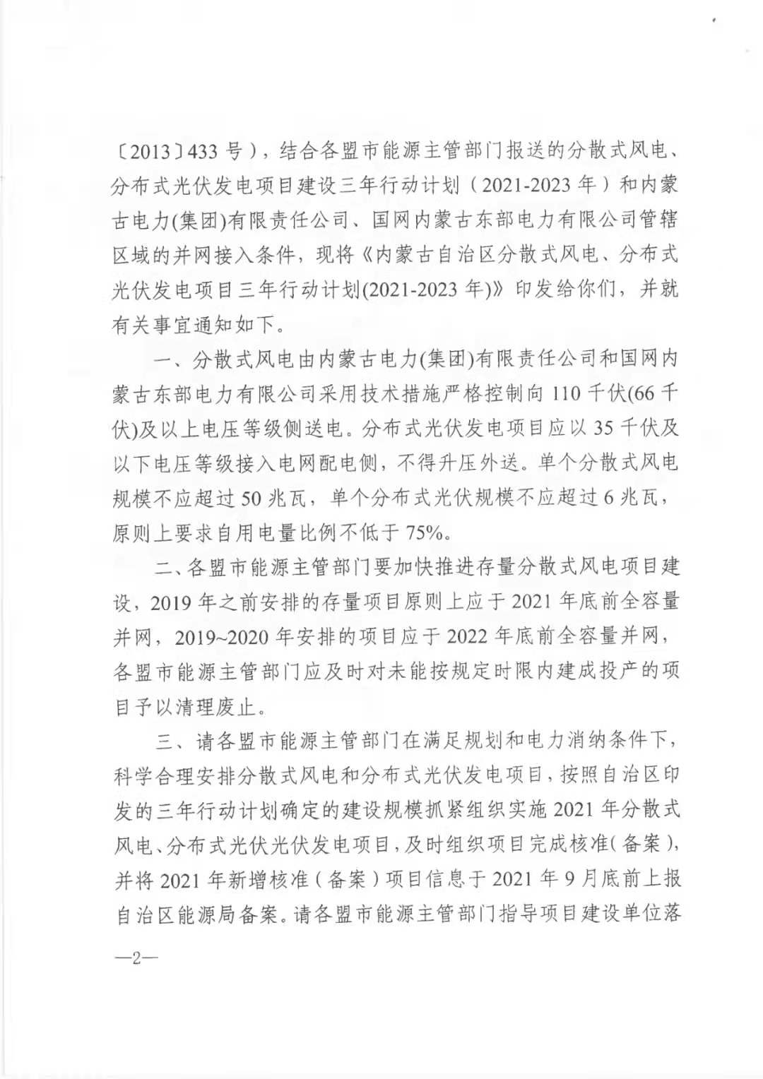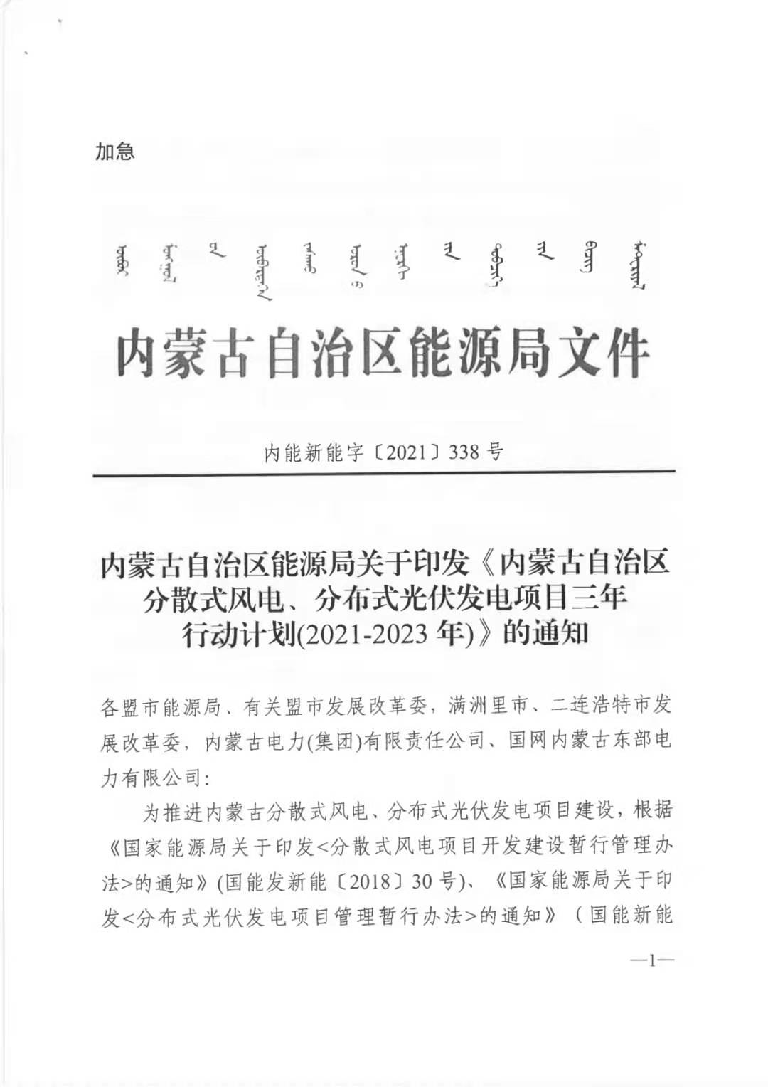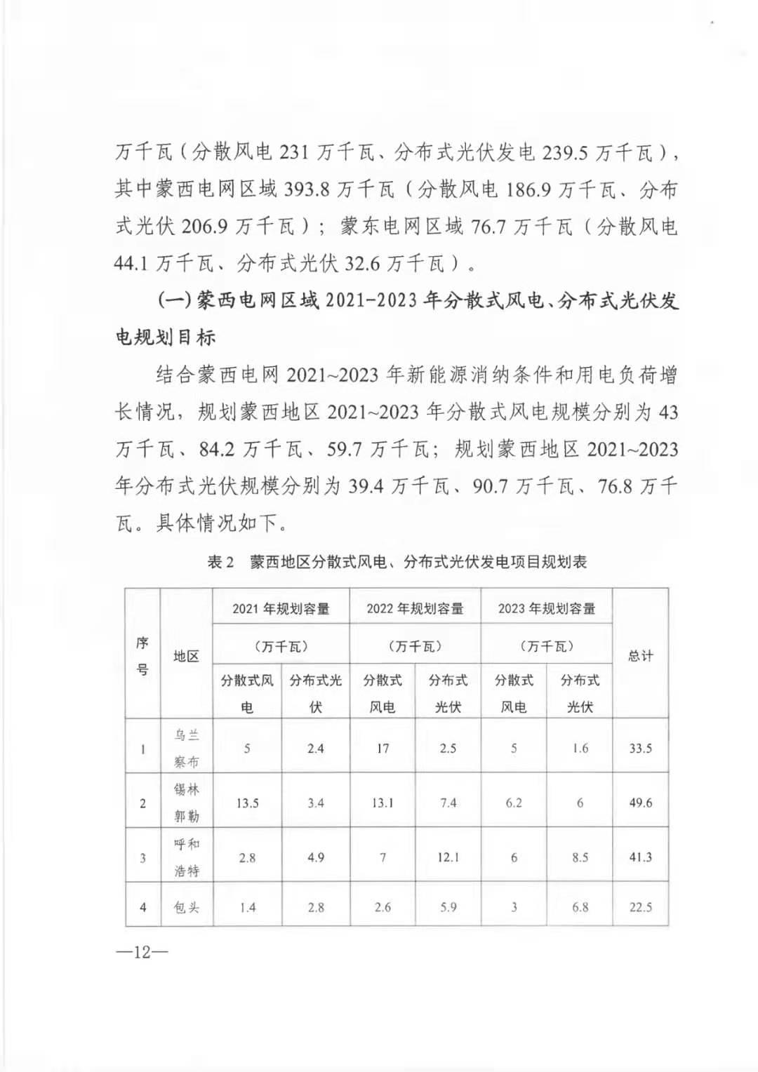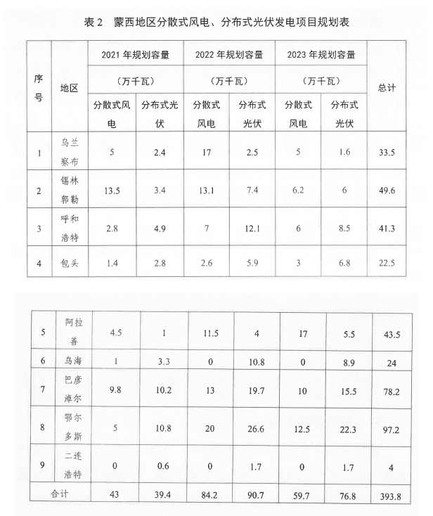 近日,内蒙古自治区能源局印发《内蒙古自治区分散式风电、分布式光伏发电项目三年行动计划(2021~2023年)》的通知,2021年~2023年规划2.395GW分布式光伏,蒙西电网区域206.9万千瓦,蒙东电网区域32.6万千瓦。