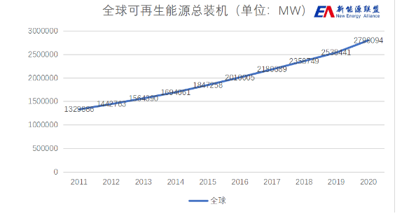 根据国际可再生能源署(IRENA)发布的《2021年年度可再生能源统计》(Renewable Capacity Statistics 2021)显示,截至2020年末全球可再生能源总装机容量为2799.10GW,相较2011年以来增长了110.48%、较2019年末的2538.44GW增长了260.66GW,增长率为10.27%。在新冠疫情肆虐,全球经济增长放缓的大背景下,2020年度可再生能源装机总容量增幅甚至超过了2019年。这无疑表明由传统能源结构向可再生能源方向转型升级是大势所趋的。