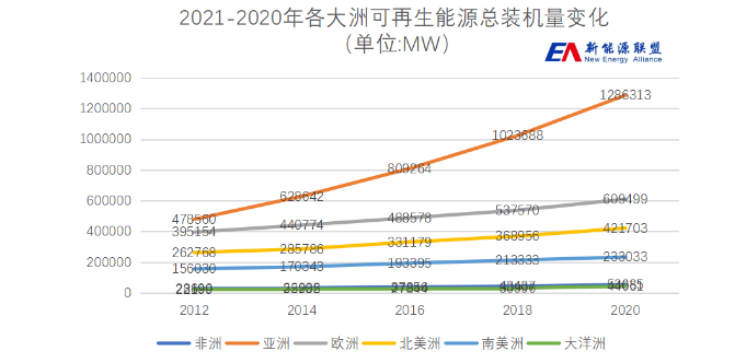 根据IRENA数据,全球可再生能源投资差异巨大。2020年,亚洲可再生能源新增装机量167.61GW,装机总容量达到1286.31GW,近十年来始终居于可再生能源装机量首位,是全球增长速度最快的地区。欧洲装机总容量居于世界第二位,2020年末为600.50GW。北美洲装机总容量居于世界第三,2020年末为421.70GW。
