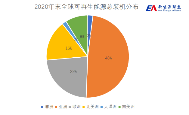 截至2020年末,全球可再生能源重点领域主要为亚洲、欧洲、北美洲、南美洲。四个洲 分别占全球装机总容量的48%、23%、16%、9%,合计96%。因此,上述四洲为全球可再生能源发展及项目投融资活动的主要市场。其中,亚洲为十年来增长最快、增幅最大、总装机容量最大的区域。