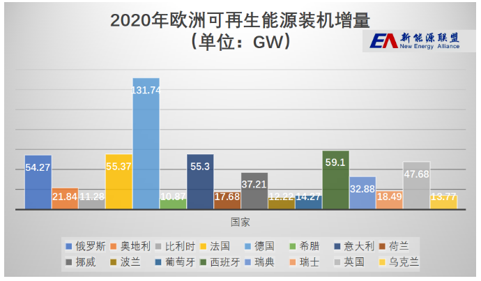 其次,在欧洲区域,共有16个国家的可再生能源装机总容量超过10GW。其中包括俄罗斯54.27GW,奥地利21.84GW,比利时11.28GW,法国55.37GW,德国131.74GW,希腊10.87GW,意大利55.30GW,荷兰17.68GW,挪威37.21GW,波兰12.22GW,葡萄牙14.27GW,西班牙59.10GW,瑞典32.88GW,瑞士18.49GW,英国47.68GW,乌克兰13.77GW。