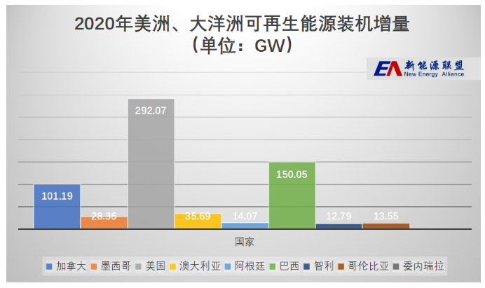 再次,在北美洲区域,共有3个国家的可再生能源装机总容量超过10GW。其中包括加拿大101.19GW,墨西哥28.36GW,美国292.07GW。