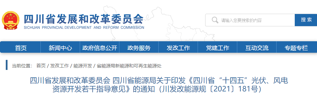 四川省发展和改革委员会 四川省能源局关于印发《四川省“十四五”光伏、风电资源开发若干指导意见》的通知(川发改能源规〔2021〕181号)