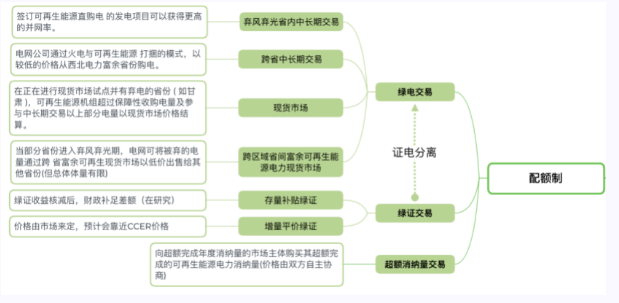 但在具体实现方面,现在国内绿电采购仍存在障碍。一是在可再生能源法、“配额制”(非水可再生能源电力消纳责任权重指标)的政策机制下,消费侧用户主动购买绿电的途径缺失,目前可以交易的大多是保障小时数以外的少部分电量,二是政策协同方面,用户采购绿电获得绿电消费凭证等证明困难,难以在碳核算时对减排进行认可。