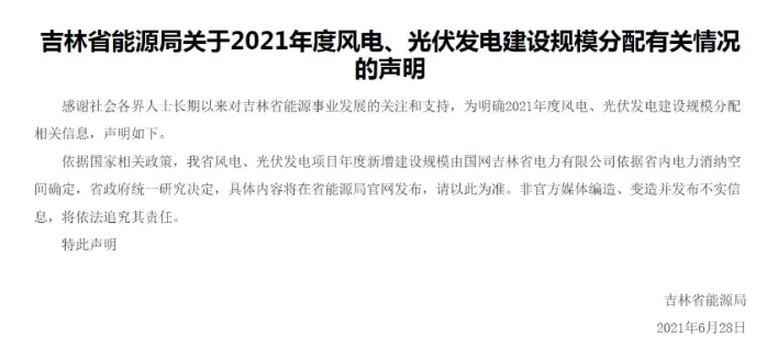 今日,吉林省能源局发布关于2021年度风电光伏发电建设规模分配有关情况的声明。