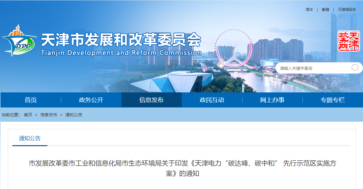 市发展改革委市工业和信息化局市生态环境局关于印发《天津电力“碳达峰、碳中和” 先行示范区实施方案》的通知