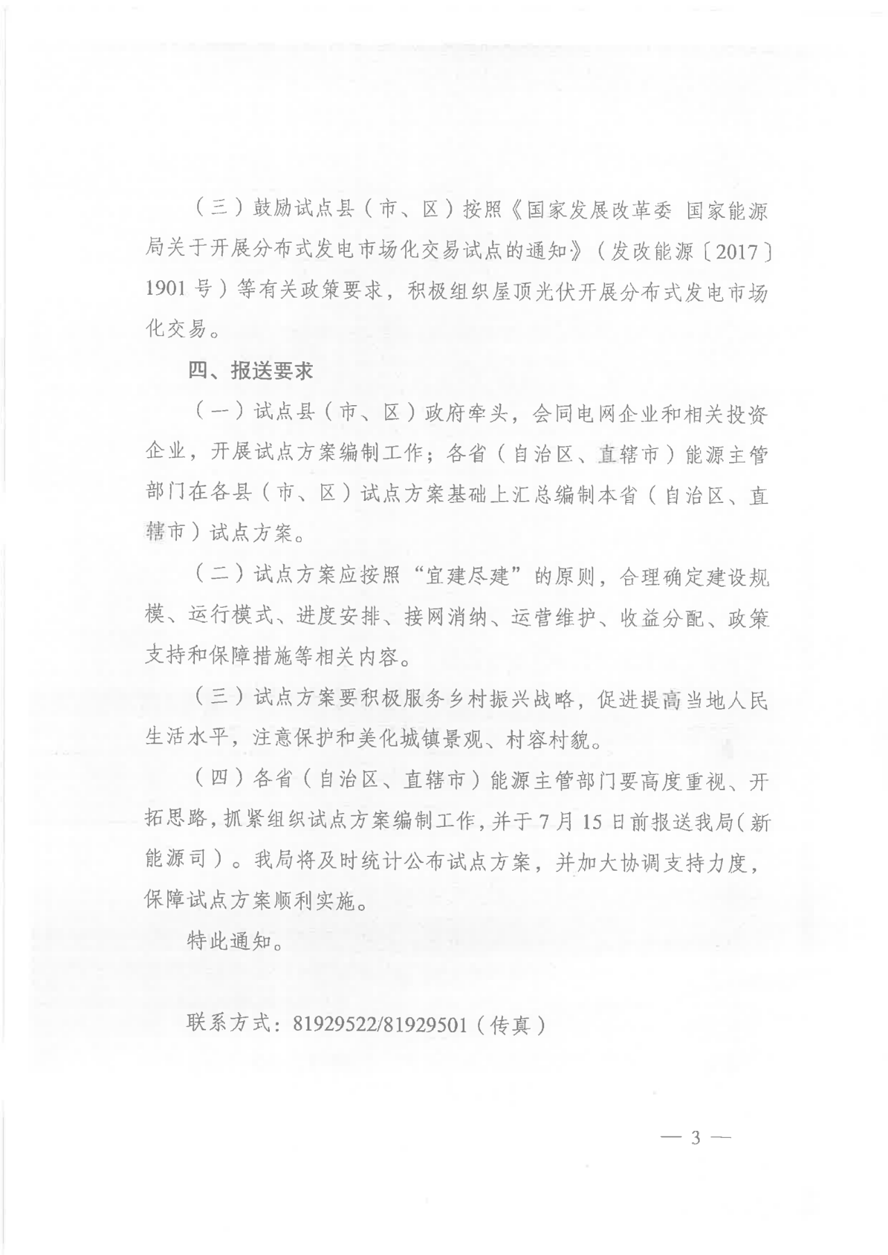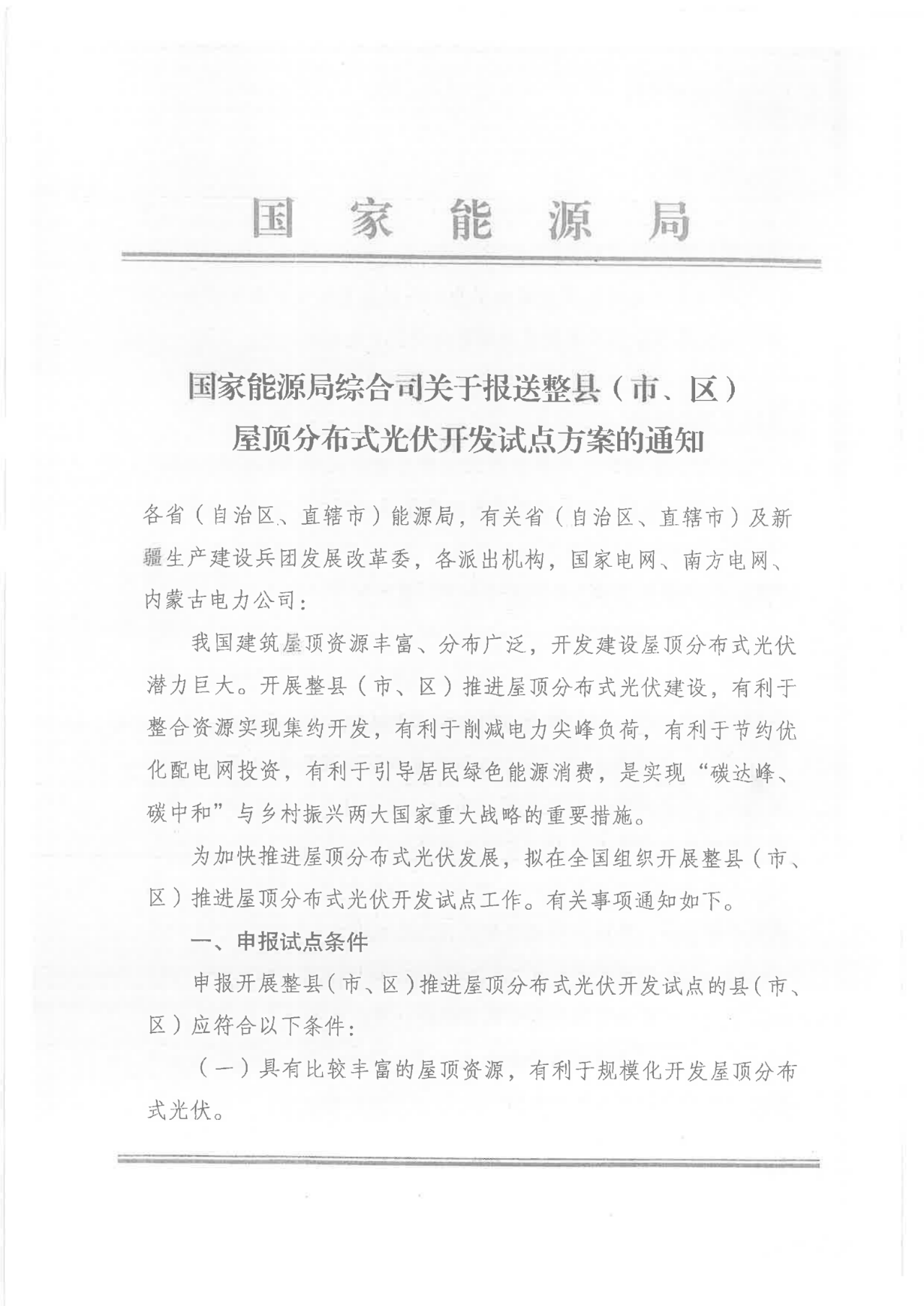 2021年6月20日,国家能源局综合司正式下发《关于报送整县(市、区)屋顶分布式光伏开发试点方案的通知》,拟在全国组织开展整县(市、 区)推进屋顶分布式光伏开发试点工作。要求:
