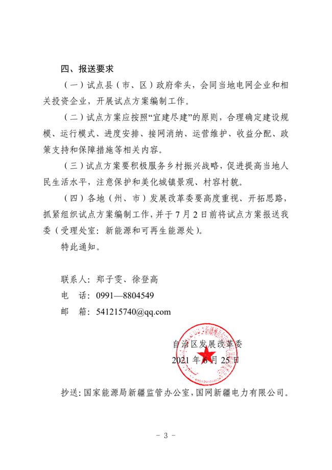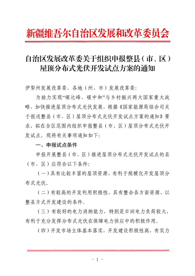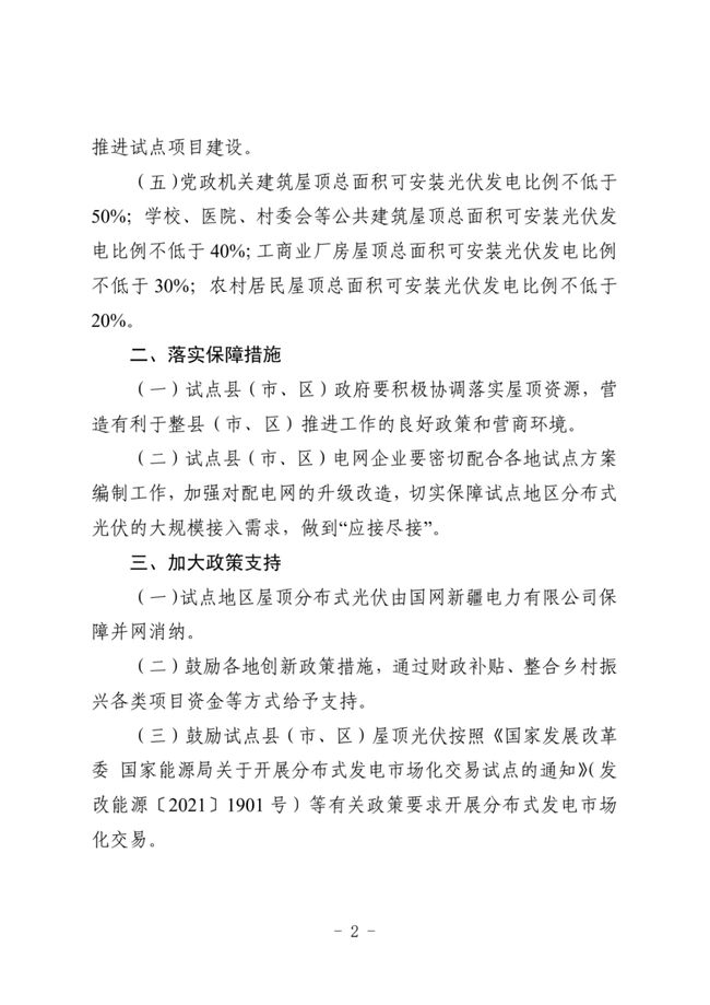 试点地区屋顶分布式光伏由国网新疆电力有限公司保障并网消纳,鼓励各地创新政策措施通过财政补贴整合乡村振兴各类项目资金等方式给予支持,试点方案要积极服务乡村振兴战略促进提高当地人民生活水平注意保护和美化城镇景观村容村貌。各地(州市)发展改革委要高度重视开拓思路抓紧组织试点方案编制工作并于7 月2日前将试点方案报送发改委新能源和可再生能源处。