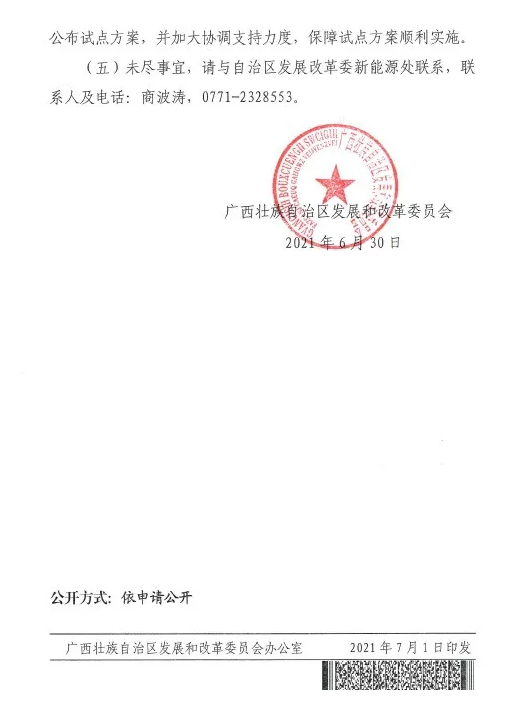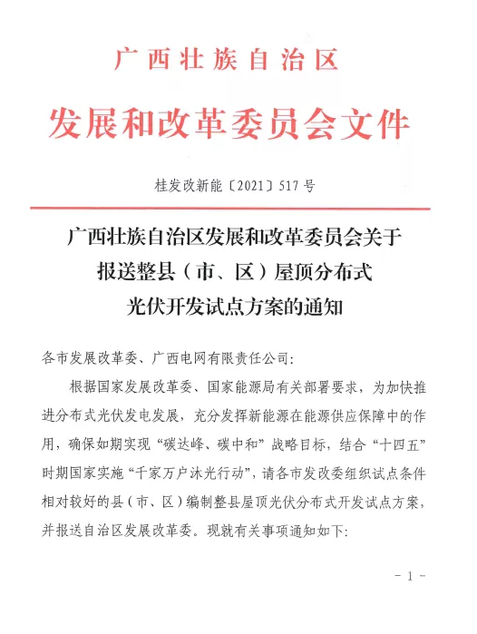 日前,广西省发改委下发《关于报送整县(市、区)屋顶分布式光伏开发试点方案的通知》。