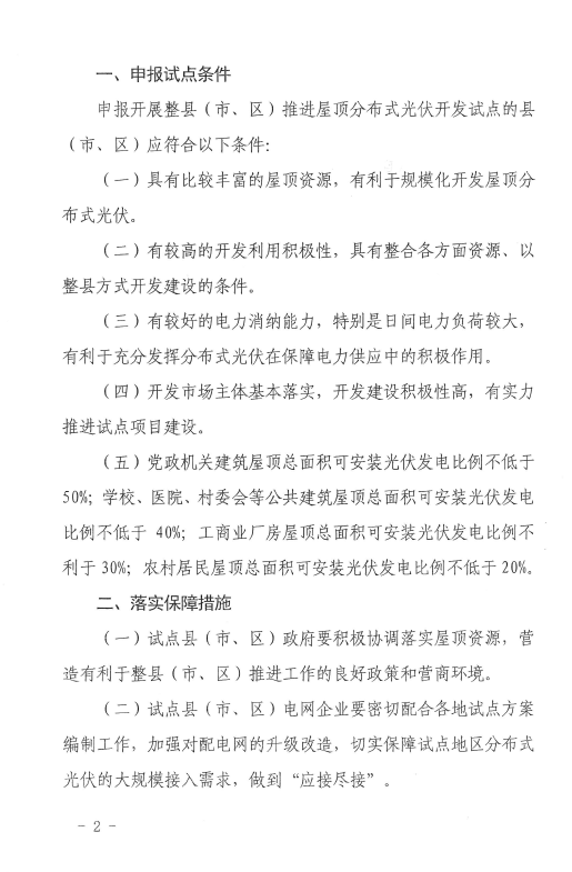 根据申报条件:党政机关建筑屋顶总面积可安装光伏发电比例不低于50%;学校、医院、村委会等公共建筑屋顶总面积可安装光伏发电比例不低于40%;工商业厂房屋顶总面积可安装光伏发电比例不利于30%;农村居民屋顶总面积可安装光伏发电比例不低于20%,具体文件如下: