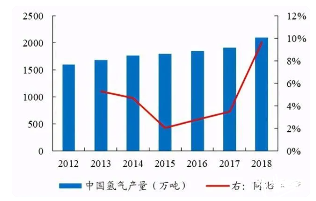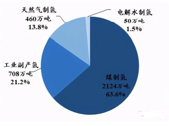 近年来,伴随着国内氢能产业的持续发展,中国氢气总产量保持着稳定增长的态势,根据中国氢能联盟与石油和化学规划院的统计,截至2019年我国氢气产能约达4100万吨/年。由于中国丰富的煤炭资源特点,煤制氢是最首要的制氢来源,不同于全球范围内18%左右的比重,煤制氢在国内占比可达六成以上,其次为工业副产氢、天然气制氢、电解水制氢。根据中国氢能联盟研究院数据,2019年中国氢气产量共计3342万吨,其中煤制氢产量2124万吨,占比达63.6%;其次为工业副产氢、天然气制氢,产量分别为708、460万吨,占比分别为21.2%、13.8%;电解水制氢产量相对较少,仅50万吨,占比1.5%。